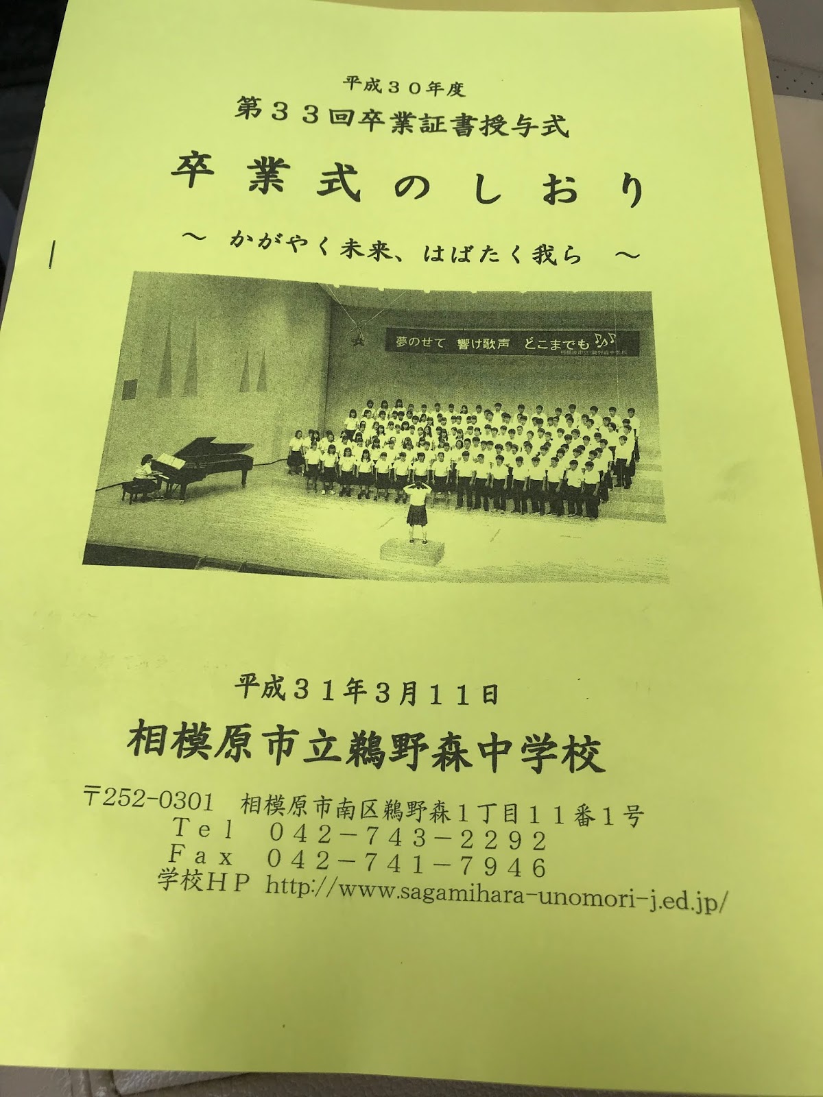 卒業式 2019年3月11日 最終更新日時 : 2019年3月11日 hiroshee 本日は、市内公立中学校の卒業式が挙行された。地元議員、そして少年野球協会会長という2つの肩書での出席であった。小学校低学年から野球をしていた多くの子どもたちが、ずいぶん大人びて見えた。それぞれに夢に向かって羽ばたいてほしい!