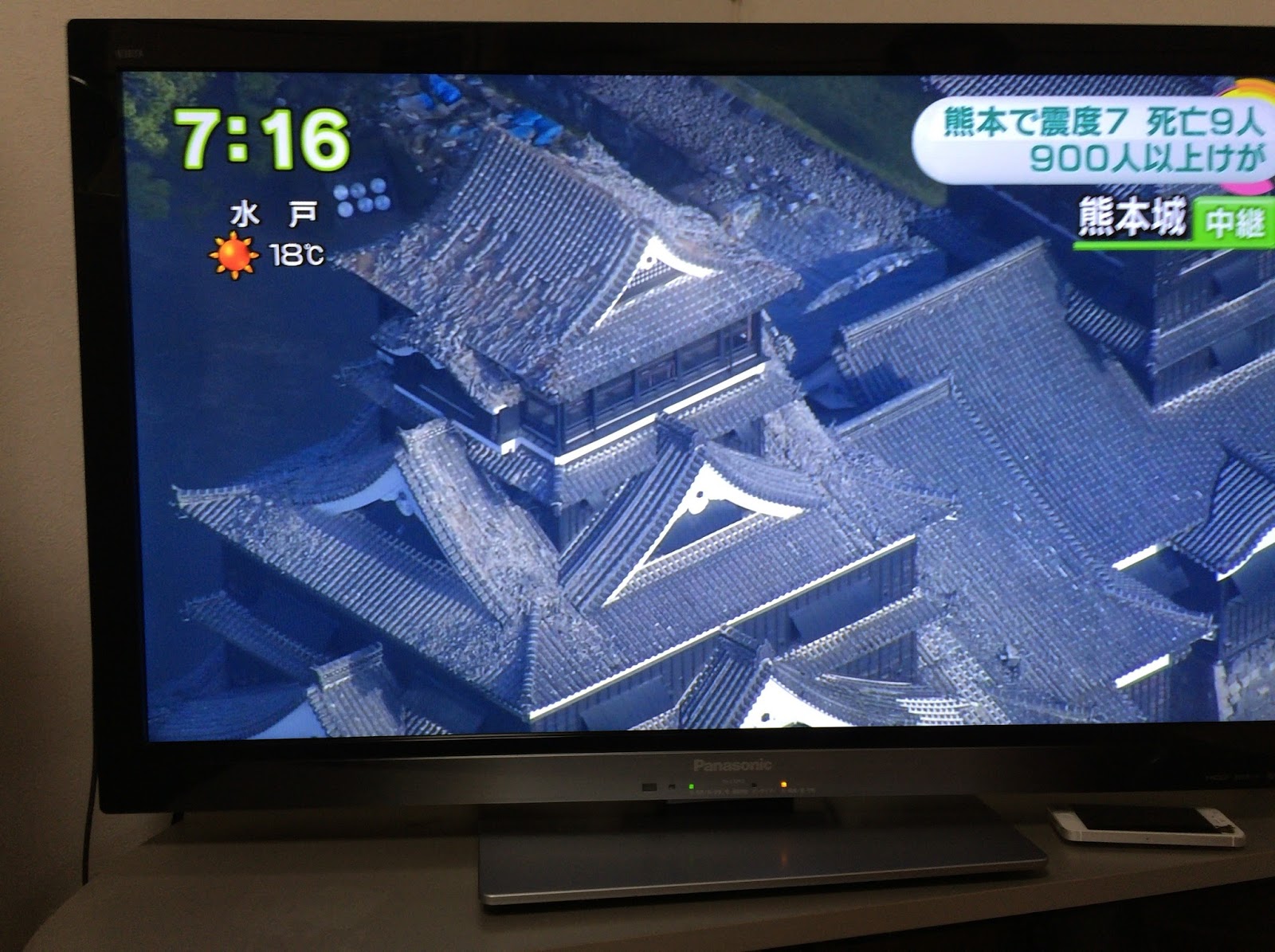 大変だ! 2016年4月15日 最終更新日時 : 2016年4月15日 hiroshee 昨夜、大変大きな地震にみまわれた熊本県。一夜明けた今朝の報道によると、益城町の被害がひどいとの事であった。余震も続いているようなので、まだ終息していない・・・被害にあわれた方々に対し、心よりお見舞い申し上げます。また、熊本市内の築城400年を迎えた熊本城の屋根瓦や、石垣の被害も大きい・・・場内の7つの建造物を約10年の短期計画で復元したばかりなのに・・・しばらくは近づかない方が賢明だろう。