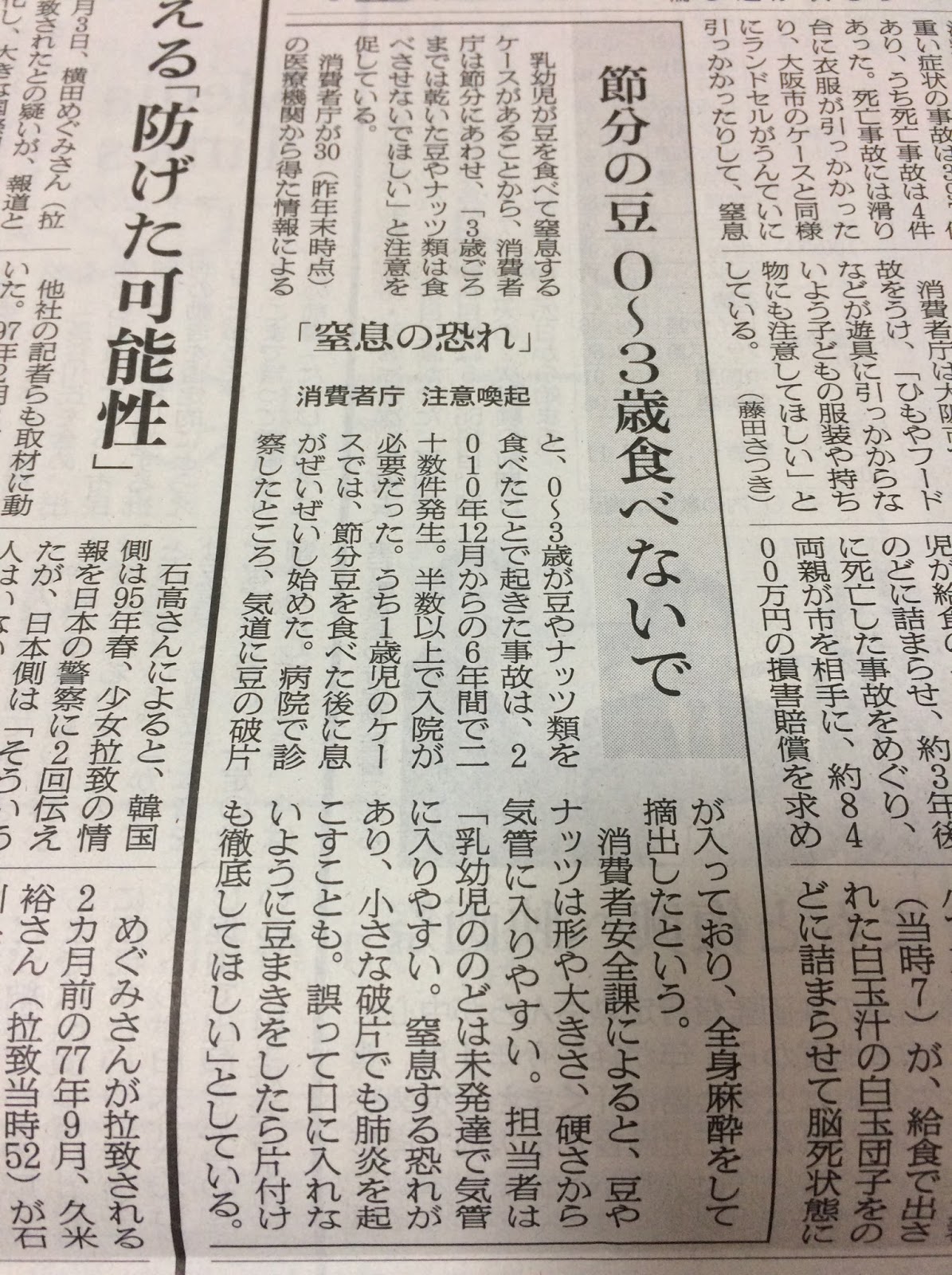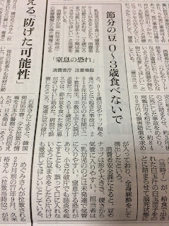 今晩は、各家庭において悪霊退治の豆まきが行われると思うが、小さい子のいる家庭は、新聞記事を参考に注意していただきたい。