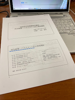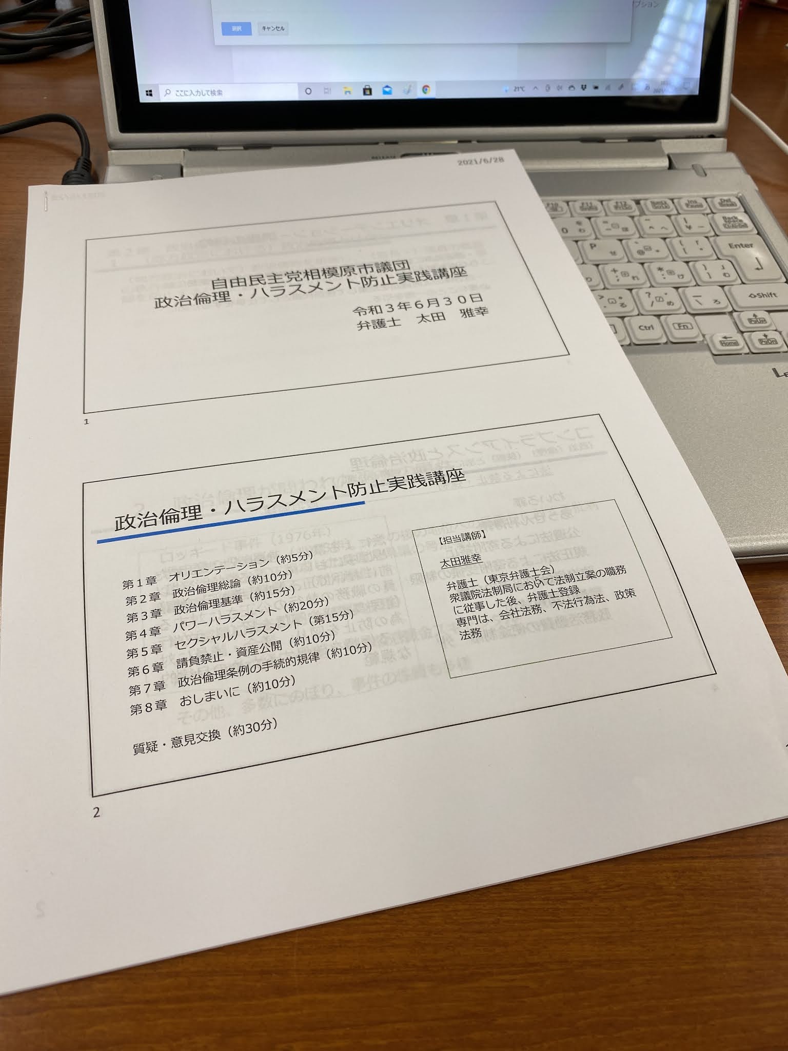 自民党市議団研修会 2021年6月30日 最終更新日時 : 2021年6月30日 hiroshee 本日は、政治倫理・ハラスメント防止実践講座ということで、太田弁護士に講演していただいた。 90分の講義のなかで思ったことは、有権者の付託を受けた議員としての自覚を持ち、しっかりと仕事をするためにも、ハラスメントは愚の骨頂であると感じた。 一般の方々ならば許されるような行為でも、公人(議員)になると✖とういことも多いとも感じた。 普段の行動を見つめなおす良い時間得た本日であった。