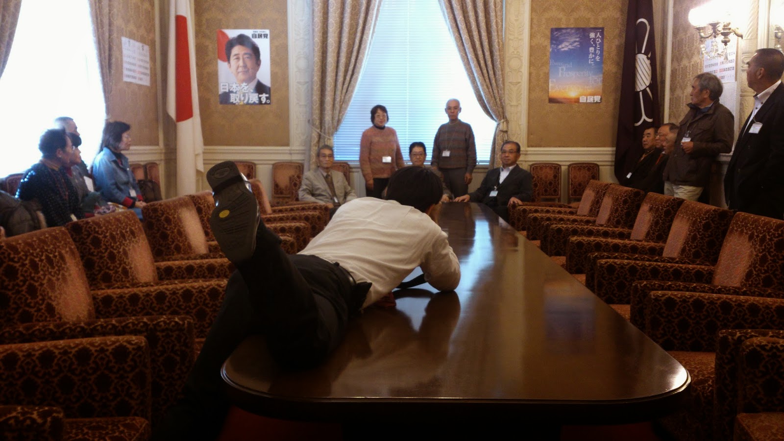 あかま二郎代議士 2013年11月14日 最終更新日時 : 2013年11月14日 hiroshee 昨日の国会見学での一コマ・・・衆議院議院運営委員会室である。時には床に跪き、時にはテーブルに腹ばいになりながら、24名の見学者相手に代議士自らカメラを構え、何十枚も撮影してくれた。普通、秘書がしなければならないでしょう!と思うところまでやってしまう、それが「あかま二郎」である。議事堂内では、案内人の如く天井のステンドグラスがどうのとか、四方の絵は誰が描いた等々も案内していただいた。