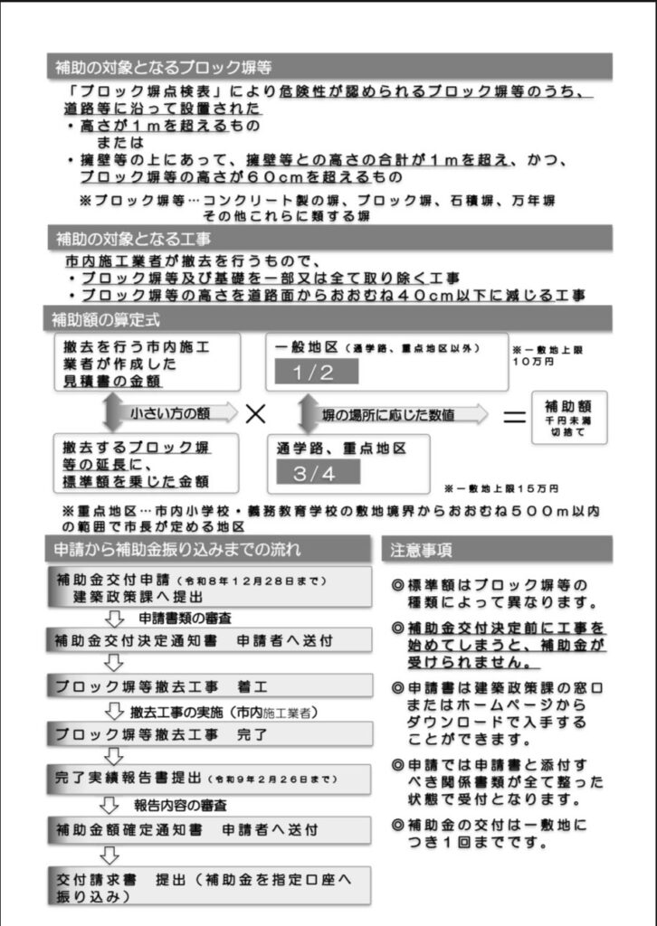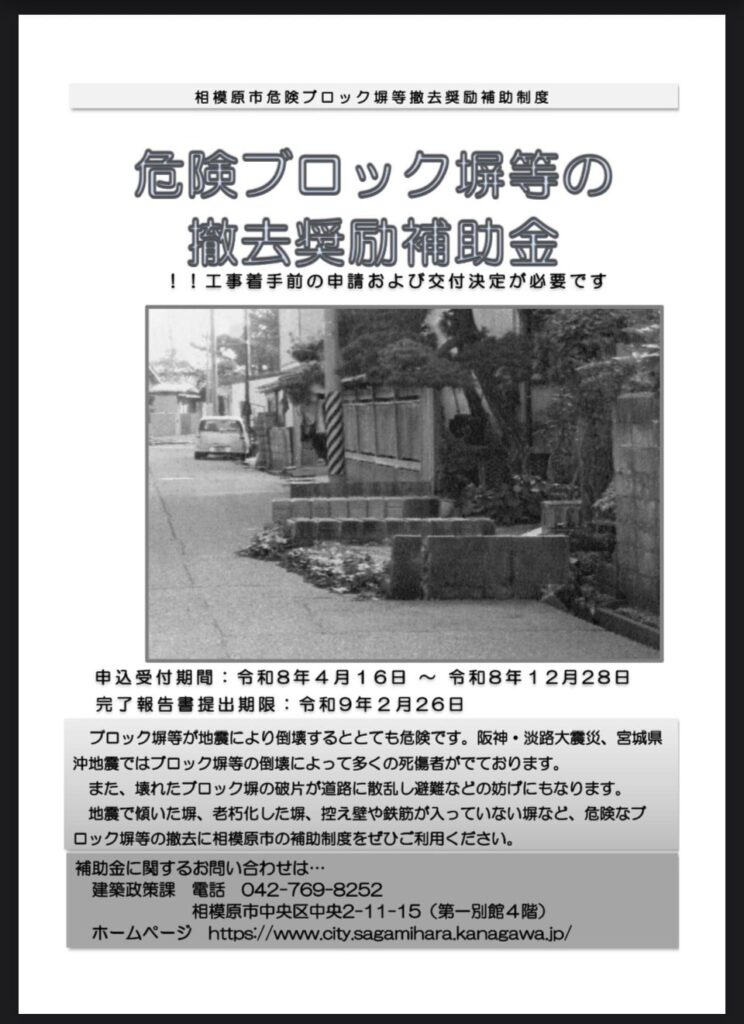 現在、相模原市では「危険ブロック塀等の撤去推奨補助金制度」をおこなっている。