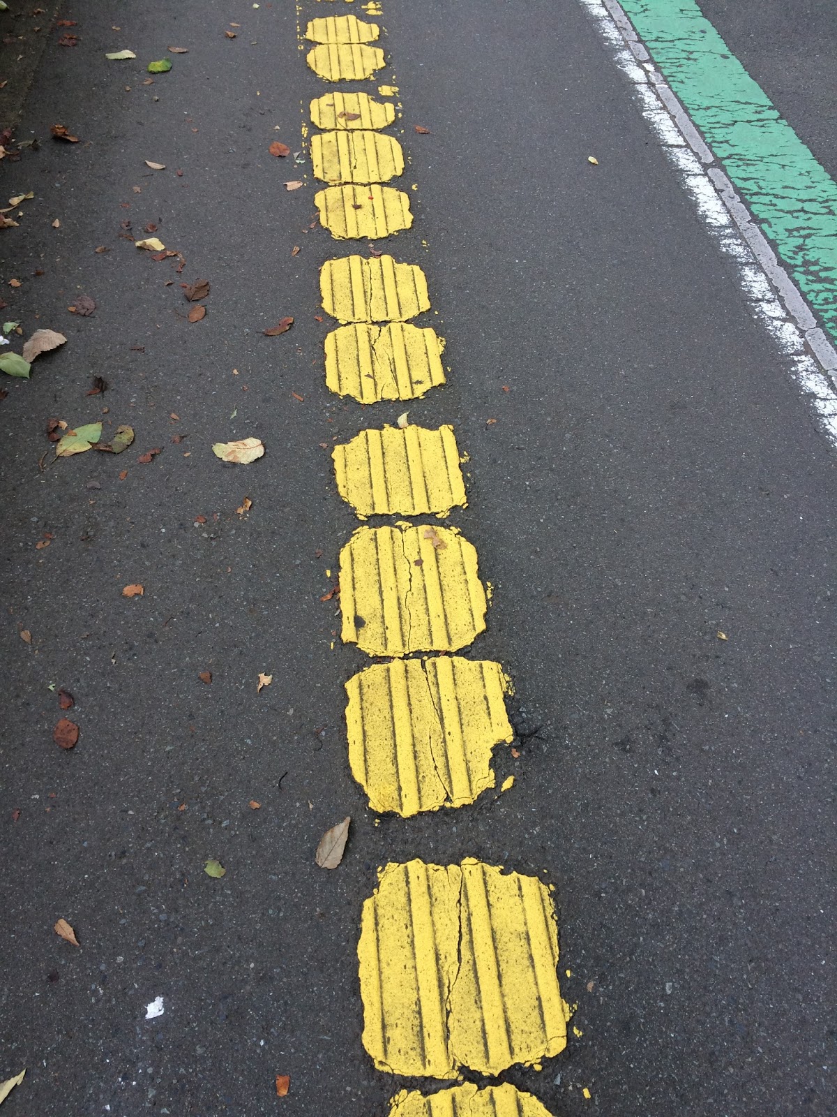それと、写真右側の自転車走行レーンのグリーン塗装も剥げかかっているが・・・・・