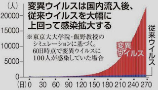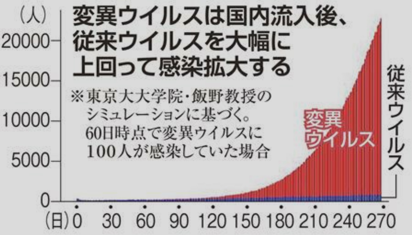 感染力が強いとされる新型コロナの変異ウイルスが国内に流入した場合、数か月後に爆発的な感染拡大を起こす可能性が高いことがシュミレーションでわかり、報道がなされた。