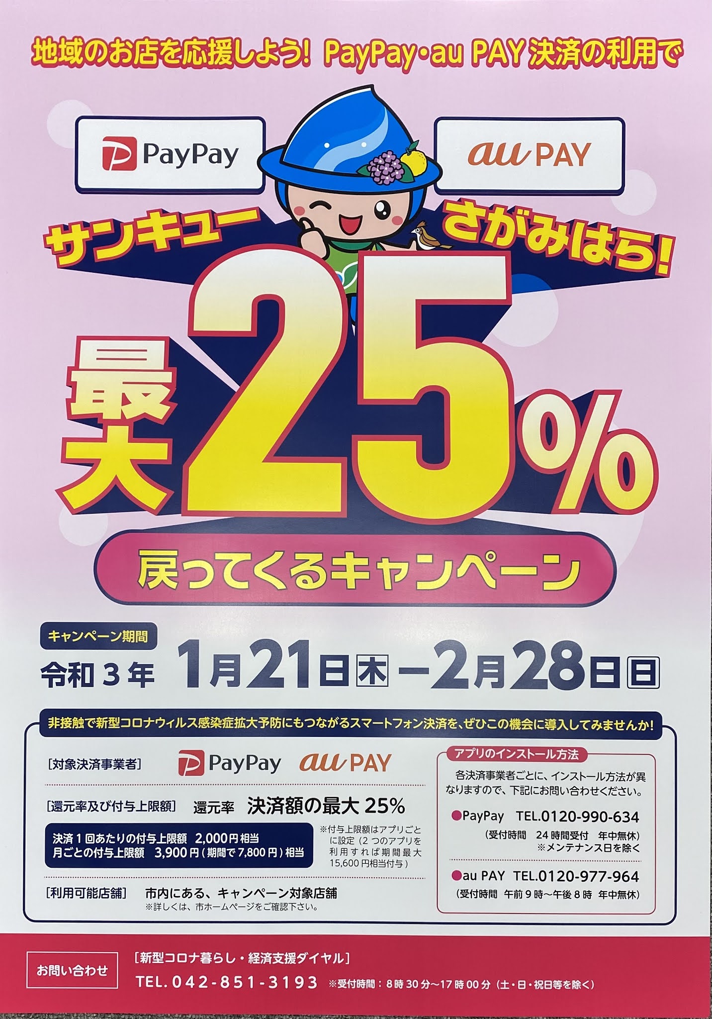 キャンペーン情報! 2021年1月6日 最終更新日時 : 2021年1月6日 hiroshee ソフトバンクグループ株式会社とソフトバンク株式会社、ならびにヤフー株式会社の3社が共同出資するPayPay株式会社とauが展開しているau PAYは、地方自治体と共同で実施している「あなたのまちを応援プロジェクト」において、相模原市が最大25%戻ってくるキャンペーンを1月21日から約ひと月間かけおこなう。 詳細については 「こちらをクリック」