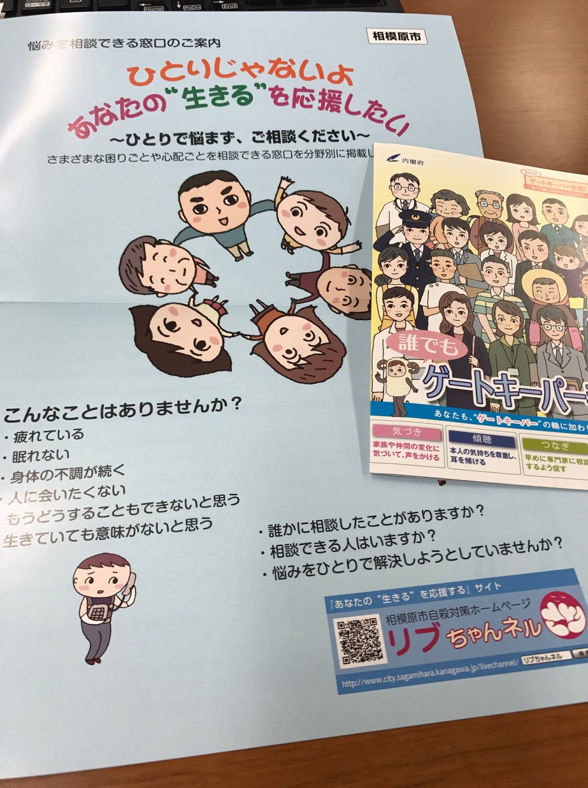一歩とどまって! 2017年9月12日 最終更新日時 : 2017年9月12日 hiroshee 日本の自殺者数は年間2万1千人あまりを数え、交通事故で亡くなる方のおよそ6倍になるそうである。神奈川県においても年間およそ1200人もの人が自殺で亡くなっている。自殺は、ひとつの理由や原因で生じるものではなく、健康問題や生活苦・借金問題、過労、リストラ等々の事柄が関係していると言われている。かながわ自殺対策会議では、ひとりで悩まないで相談してほしいと広く周知活動を展開している。