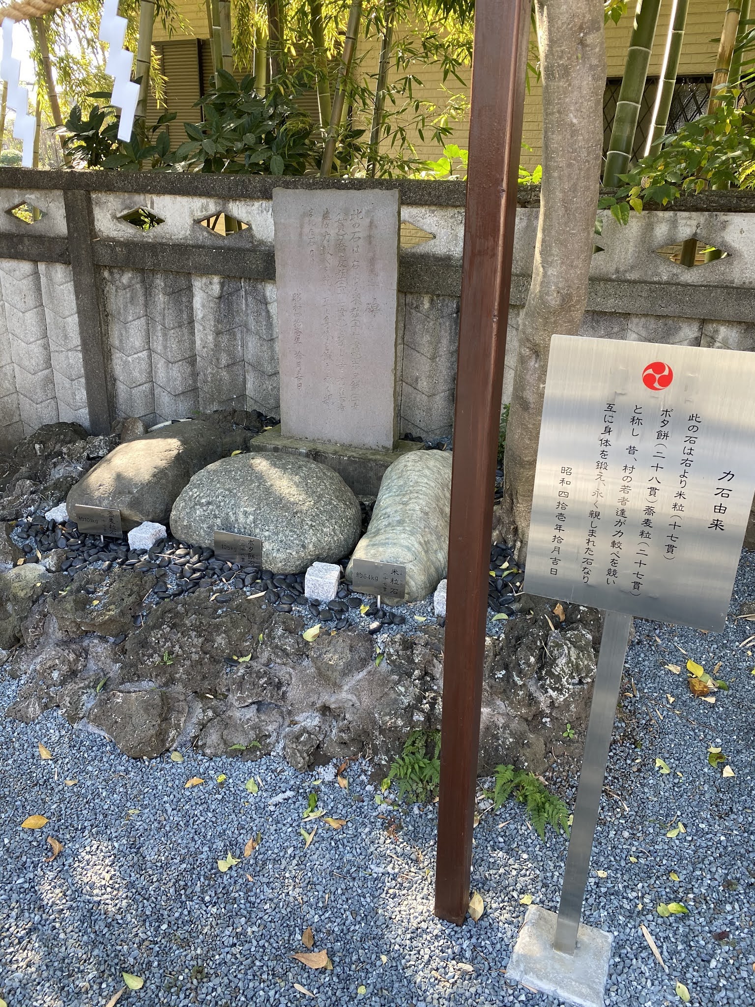 神社の参道わきには、たしか昨年だったと思うが、リニューアルされた「力石」が奉納されている。