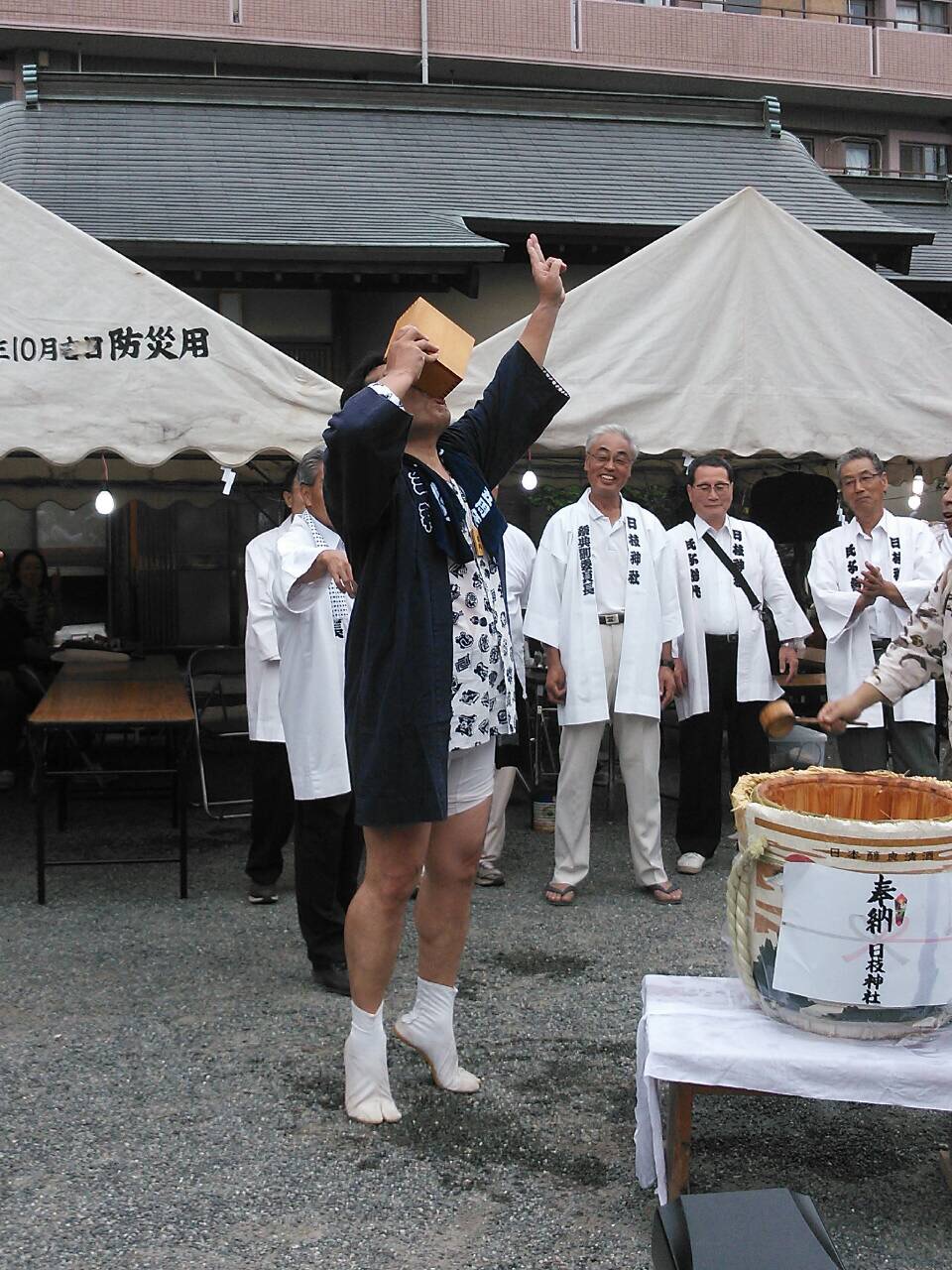 今年も・・・ 2015年9月14日 最終更新日時 : 2015年9月14日 hiroshee 例年祭り後の月曜日は身体のあちらこちらが痛い・・・ 日頃の鍛えが足らないのだ・・・と分かってはいるものの、学習しない自分が悪い、とまたまた今年も反省↘ 昨日の宮入り後におこなわれた直会(なおらい)では、地元消防団の部長としてグビッ! 一升マスに樽酒を注がれ、一気に飲み干す!やはり疲れた身体に冷たい日本酒は、利く~ 当然、夜更けまで地元の方々と杯を交わしながら懇親を深めさせていただいた!