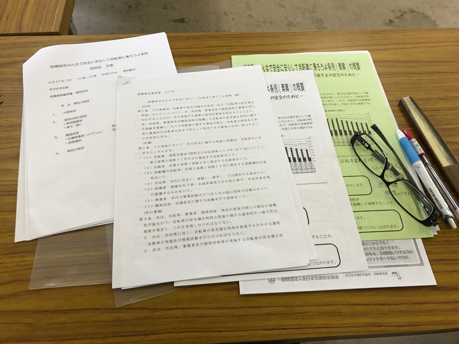 今日で終了! 2017年4月28日 最終更新日時 : 2017年4月28日 hiroshee 「相模原市みんなで安全に安心して自転車に乗ろうよ条例」制定に向けた市内4警察署とその関係団体への説明会が終了した。質疑応答において、さまざまなご意見をいただいたので、反映しながら実効性ある条例に仕上げて生きたいと思う!