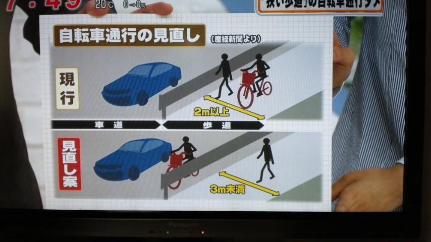 現行では、歩道が2メートル以上であれば自転車通行もよいとの事だが、見直し案として3メートル未満の歩道は自転車通行はダメよ!との事。