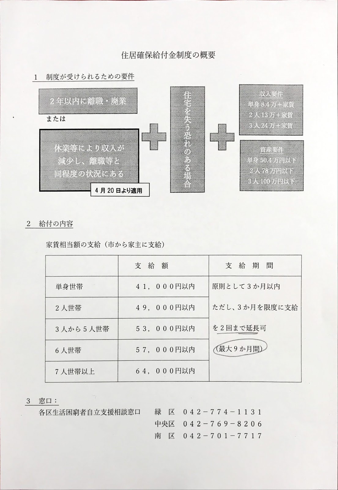 住宅確保給付金について 2020年6月15日 最終更新日時 : 2020年6月15日 hiroshee 休業等に伴う収入の減少により、住居を失うおそれが生じている方々について、原則3ケ月、最大9ケ月、家賃相当額を市から家主さんに支給する制度がある。申請できる方は、離職や廃業から2年以内の方についてがこれまでの制度だったが、本年4月20日以降については離職や廃業から2年以内または休業等により収入が減少し、住居を失うおそれがある方となる。また、4月30日からはさらに使いやすく、今まで必要とされた「ハローワークへの求職申込み」が不要になった。