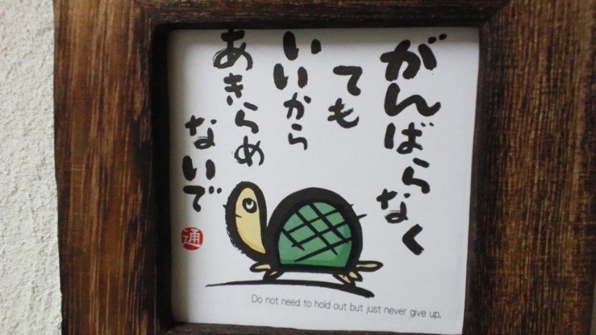 先日あるところで・・・ 2011年3月7日 最終更新日時 : 2011年3月7日 hiroshee このような壁掛けを発見した。 「がんばらなくてもいいから あきらめないで」と誰かが亀に言っていた。がんばって、がんばって、それでダメでも、もう一踏ん張り!「何が何でもガンバレ!」また、あきらめないで!ではなく、決して「あきらめるな!」と自分自身に言い聞かせる毎日である。