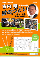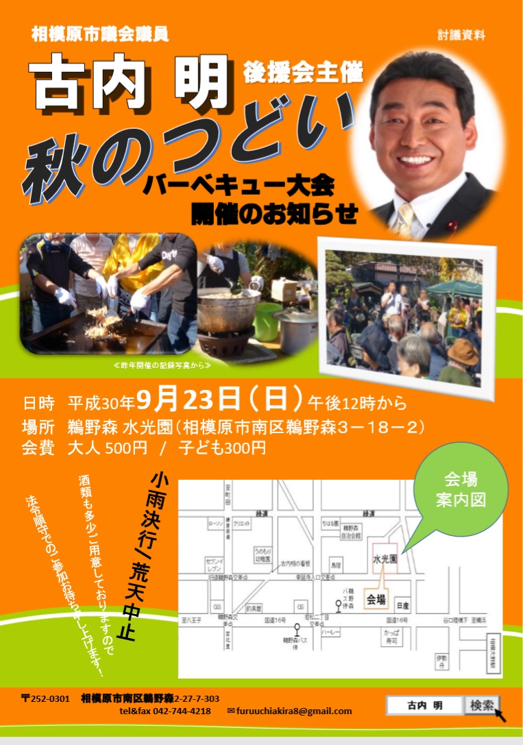 告知 2018年8月14日 最終更新日時 : 2018年8月14日 hiroshee 来月9月23日(祝・日)後援会主催の「秋のつどい」を開催いたします。昨年は11月に開催しましたが、今年は少々早めとなりました。例年おこなっている催しの一つですが、なるべく来場者に負担をかけないよう役員一同で知恵を出し合い企画を練っています。今年も後援会副会長の自宅庭をお借りしての開催となりますが、多くの方々に来場いただき、来年に向け弾みをつけたいと思いますので、ご参加のほど、宜しくお願いいたします。開催案内のチラシについては、今週末から配布させていただく予定です。