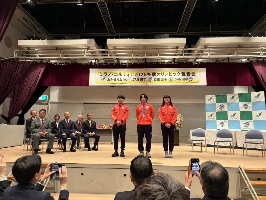 スノーボード男子ハーフパイプに出場し、見事「金メダル」を獲得した光明学園相模原高等学校出身の戸塚優斗選手をはじめ、スケートショートトラックの岩佐暖選手、女子カーリングの小谷優奈選手の3選手から報告がなされた。