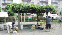 夏まつり2週目 2011年7月23日 最終更新日時 : 2011年7月23日 hiroshee 先週に引き続き、本日も各自治会主催の夏祭りが開催される。 承知しているだけでも夕方から夜にかけて、7ヶ所ほど回らせていただく。 自身の属する自治会も本日開催である。朝からテント張りや「焼きそば」「やきとり」コーナーのセッティングのお手伝い。 藤棚の枝が伸びていたので刈り込み中、スズメ蜂の巣を発見! なんと、手の平ほどの大きさまで作り上げられていた。 急きょ市の公園課に連絡し、業者を向かわせてもらい無事に駆除。 夕方から無事に夏祭りが開始されるであろう。
