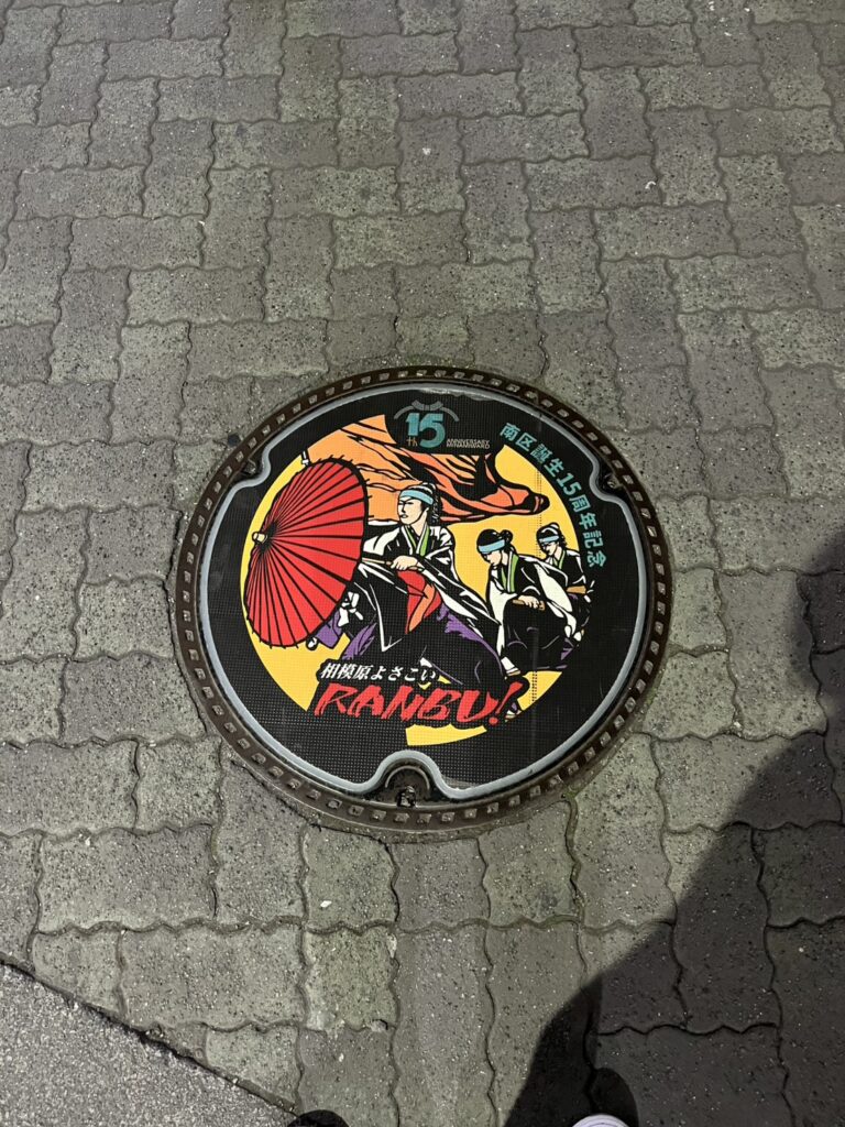 写真は、大野中地区にある唯一の鉄道駅(JR横浜線古淵駅)前に設置された、切り絵作家の梶原先生作「よさこいマンホール」である。