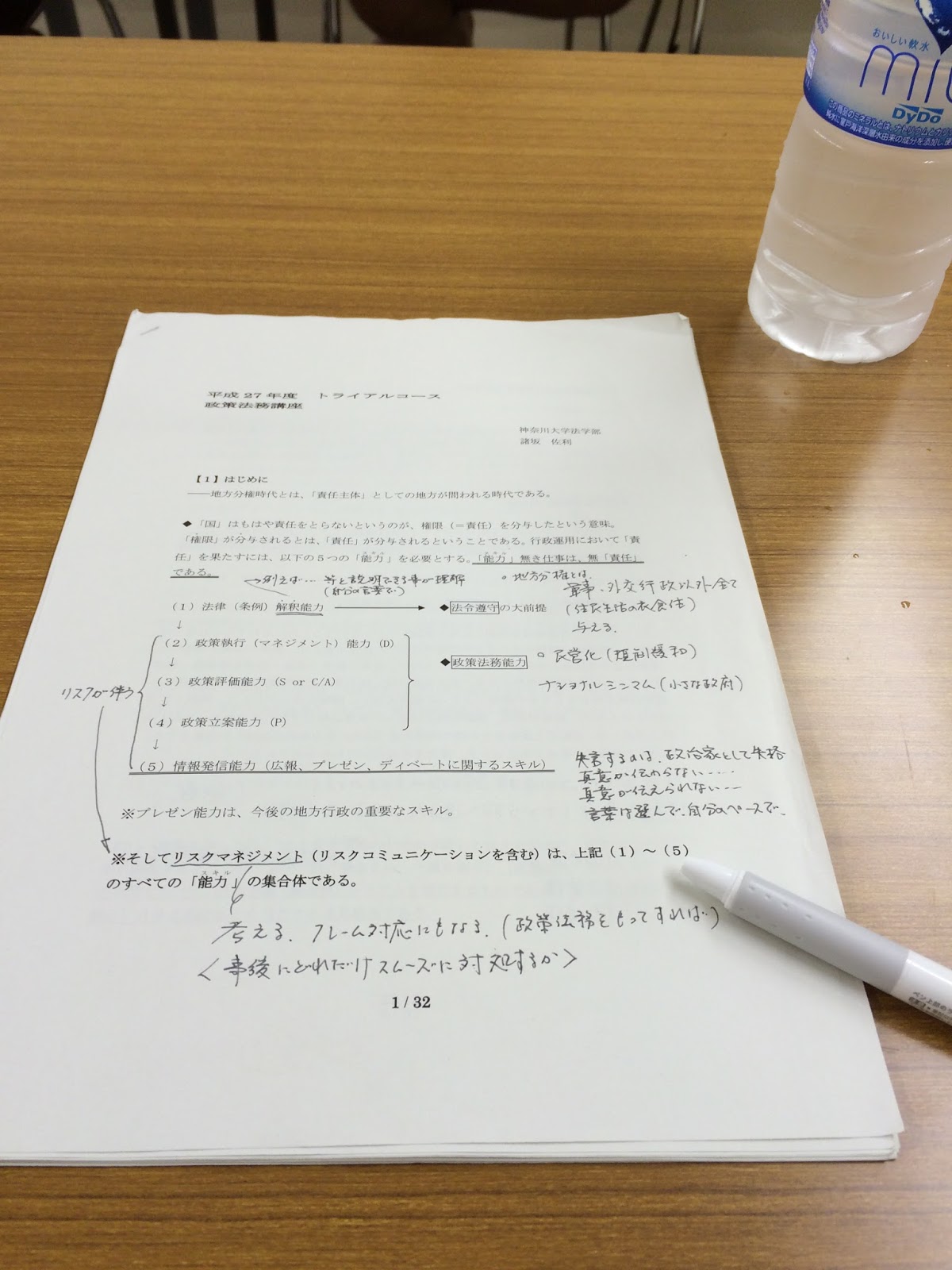 学びに終わりはない! 2015年7月27日 最終更新日時 : 2015年7月27日 hiroshee 先月から神奈川大学院で政策法務について勉強をしている。いわゆる地方議会の法律である条例の見直しや制定に向けての勉強だ。 条例関係については、一期目の時からさまざまと勉強してきた。中央大学院や明治大学院の教授を招聘して学ばせていただき、昨年には「相模原市がんばる中小企業を応援する条例」を制定することができた。条例というのは制定した後が大事で、その後の検証がもっとも重要な作業の一つである。 まず、市の課題や市民の思い等、色々とリサーチしながら次に進みたいと考えている。