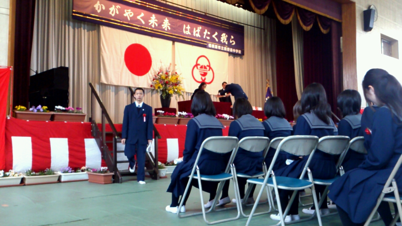 巣立ち! 2013年3月8日 最終更新日時 : 2013年3月8日 hiroshee 平成24年度、鵜野森中学校の第27回卒業証書授与式に招かれ出席してきた。今年度の卒業生は、男子89名 女子85名の計174名であった。息子の後輩になる野球部の子が校歌の指揮者だったり、記念品をいただく係りだったり、非常に目立っていたのが印象深かった。 ちなみに、この学校の校歌『光 永遠に』はいつ聞いても素晴らしい!皆さんにも機会があれば是非とも聞いていただきたい他に例のない名曲だと思う!