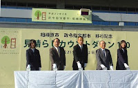 来年4月1日の政令指定都市移行まで100日前となった12月22日、市役所正面玄関前で移行までの日数を知らせる「カウントダウンボード」の点灯式を行いました。点灯前にはアトラクションとして、県立相模原高校のマンドリン部と吹奏楽部の生徒が、若さと躍動感あふれる演奏を披露しました。カウントダウンボードは、市役所本庁舎のほかにJR橋本駅のペデストリアンデッキ、移行50日前の平成22年2月10日には小田急線相模大野駅・ペデストリアンデッキにも設置されます。