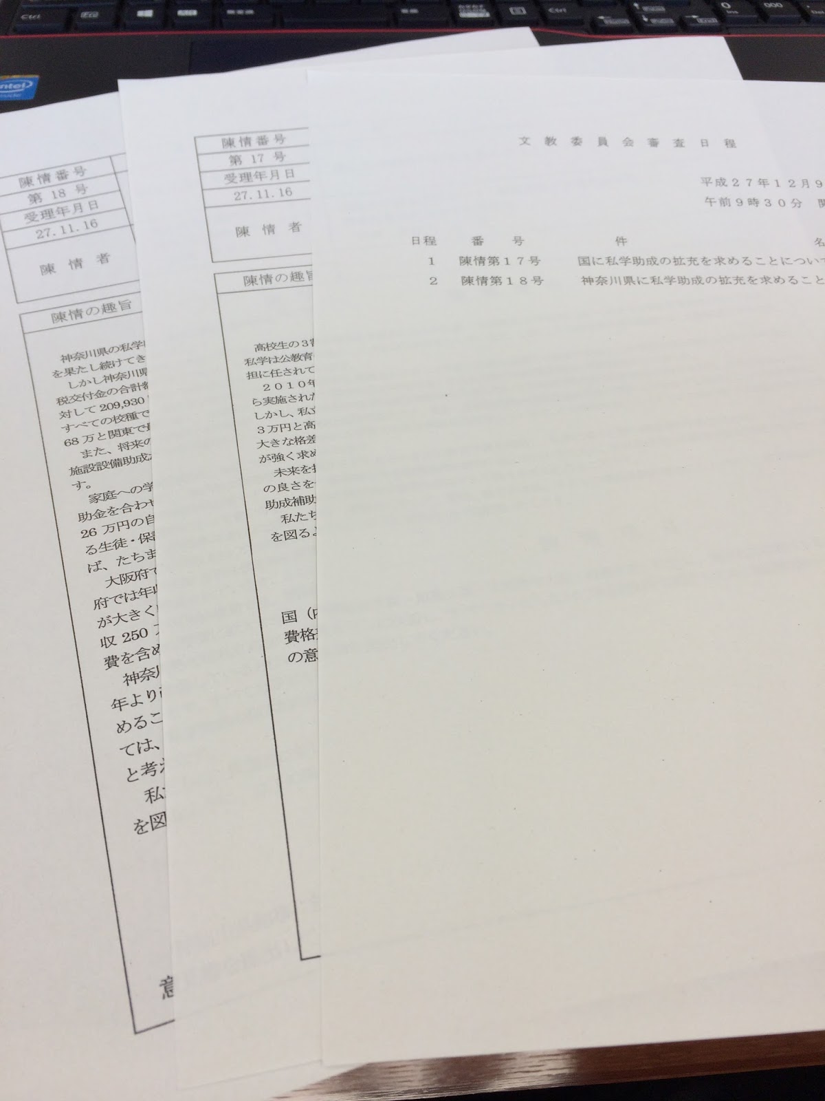 議題は、陳情2本(国に私学助成の拡充を求めることについて・神奈川県に私学助成の拡充を求めることについて)である。
