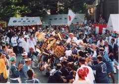 翌日曜日には、本神輿(写真右)がam11:00に宮出しされ、町内を練り歩きpm3:30に宮入り。