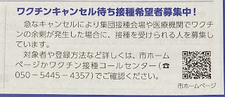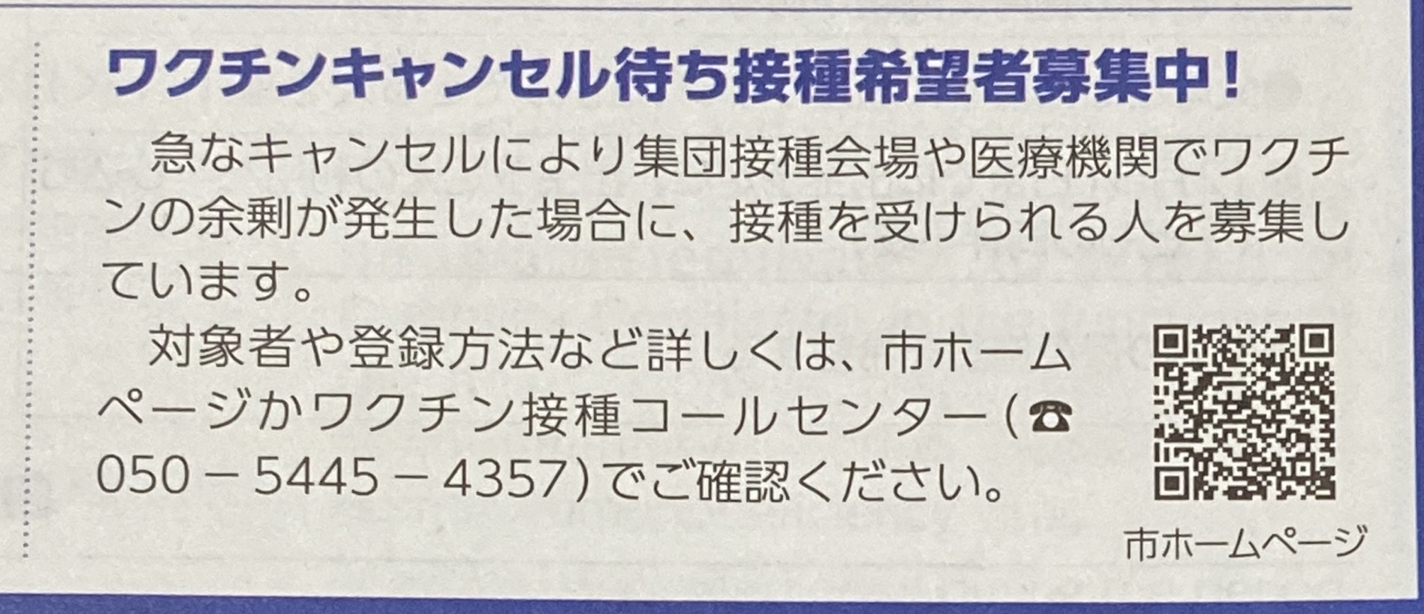 昨日の朝! 2021年10月2日 最終更新日時 : 2021年10月2日 hiroshee 昨日ブログ投稿後、新聞と一緒に配布された「広報さがみはら」で、キャンセル待ち接種希望者募集中!というお知らせが掲載されていた。 一般質問において、提言した成果だと思う。