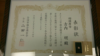 本日10年表彰 2017年5月31日 最終更新日時 : 2017年5月31日 hiroshee 本日より6月30日までの31日間の6月定例会議が始まった。来週の代表質問後、各委員会に議案が付託され審議される。また、今定例会議においては一般質問をおこなう順番なので、早めに課題の抽出をおこない作成しなければと思っている。平成19年の初当選から10年が経過した。その間、20回の一般質問を行い市政・地域課題も多く解決してきた。今期は今回を含め4回の質問を展開する予定である。