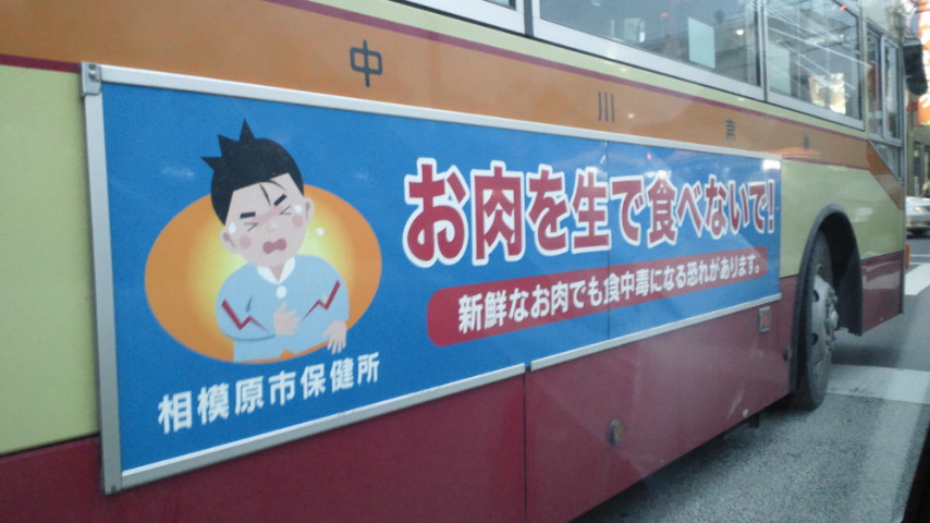 注意喚起! 2012年3月5日 最終更新日時 : 2012年3月5日 hiroshee 昨年4月、腸管性出血性大腸菌O-111が原因で複数名が死亡する食中毒事件が発生した。その後10月に生食用牛肉の新基準が施行され、食肉業界等に周知された。その新基準には確りと罰則規定も設けられ、より厳しい内容であると思う。先日、地元相模原を走る「神奈中バス」の広告掲示板でも相模原保健所からのお知らせという形で注意喚起している。「レバ刺し」は最高に美味しいが、命には代えられないので我慢である。