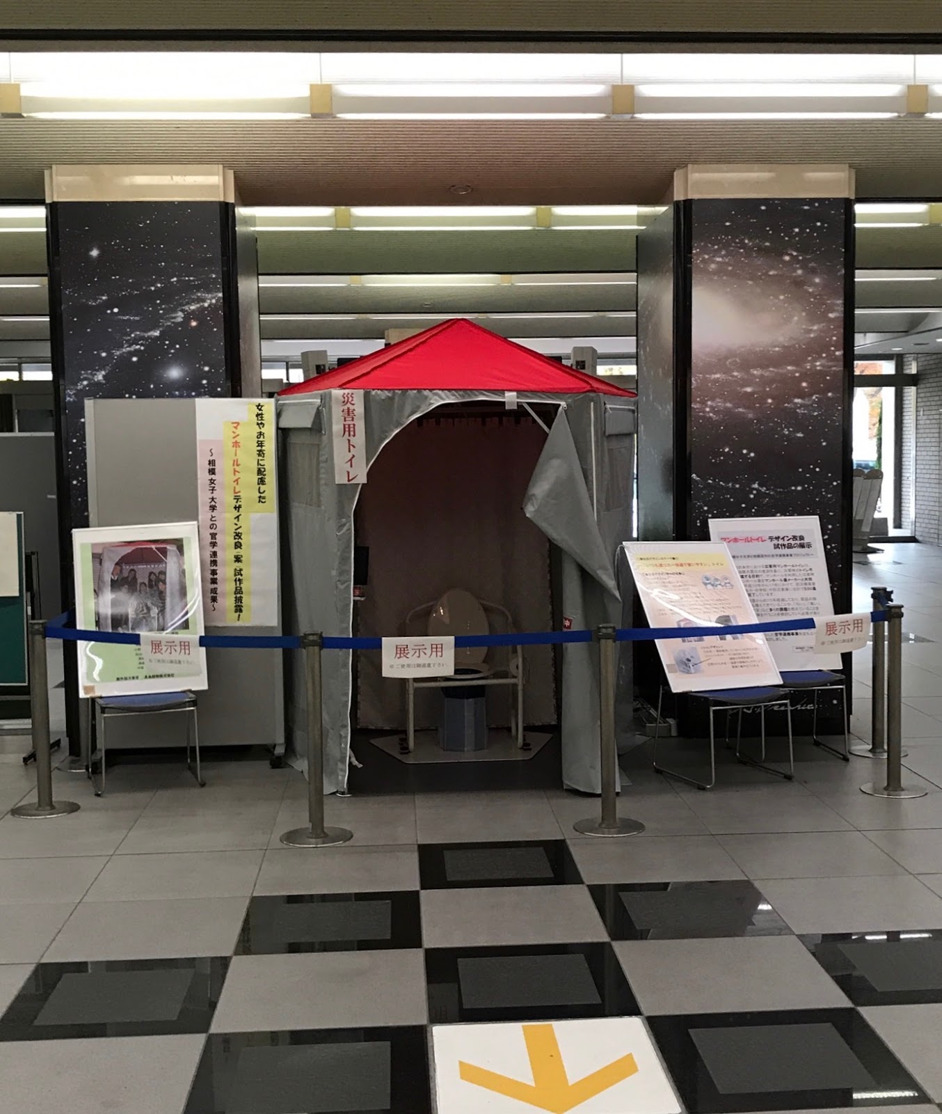 相模原市役所本庁舎1階ロビーの正面に「災害時用マンホールトイレ」デザイン改良案試作品が展示されている。