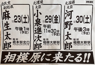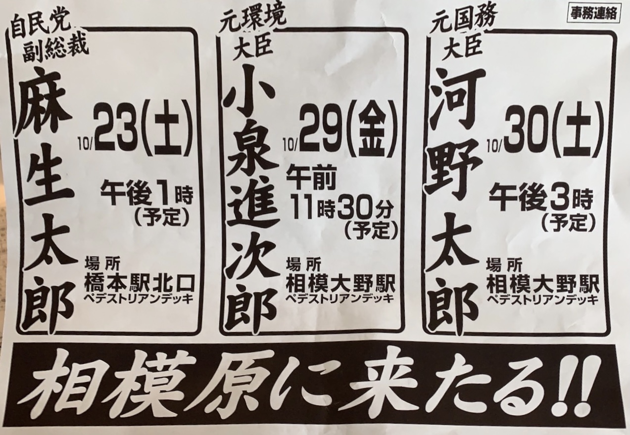終盤戦に向け! 2021年10月26日 最終更新日時 : 2021年10月26日 hiroshee いよいよ衆議院選が佳境に入ってきた。 政府与党の閣僚経験者が、23日の麻生太郎自民党副総裁を皮切りに、ぞくぞくと相模原入りし「あかま二郎」候補の応援に入ってくる。 選対速報によると、30日(土)に岸田内閣総理大臣が応援に入るという情報が入ってきた。 あと4日、まだまだ予断を許さない状況である。