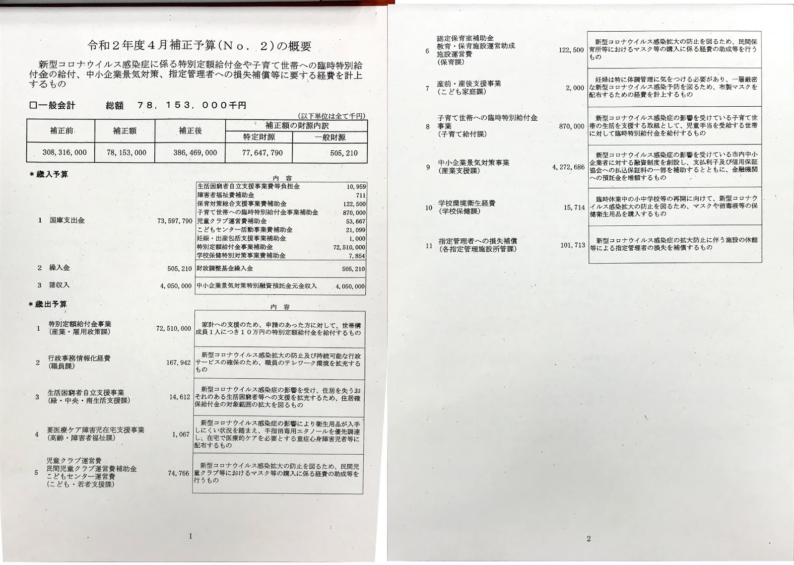 臨時会議 2020年5月1日 最終更新日時 : 2020年5月1日 hiroshee 本日、本年度一般会計補正予算案などの2議案の審査をおこなった。補正予算には、新型コロナウイルスの感染拡大で業績が悪化した市内中小企業向けの融資制度創設費用や、全国民に給付される特別定額給付金、子育て世帯への臨時特別給付金の給付等々を可決し、散会となった。