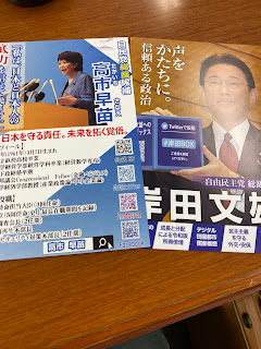 高市早苗さんと岸田文雄さんから自民党総裁候補という葉書が昨日配達されてきた。