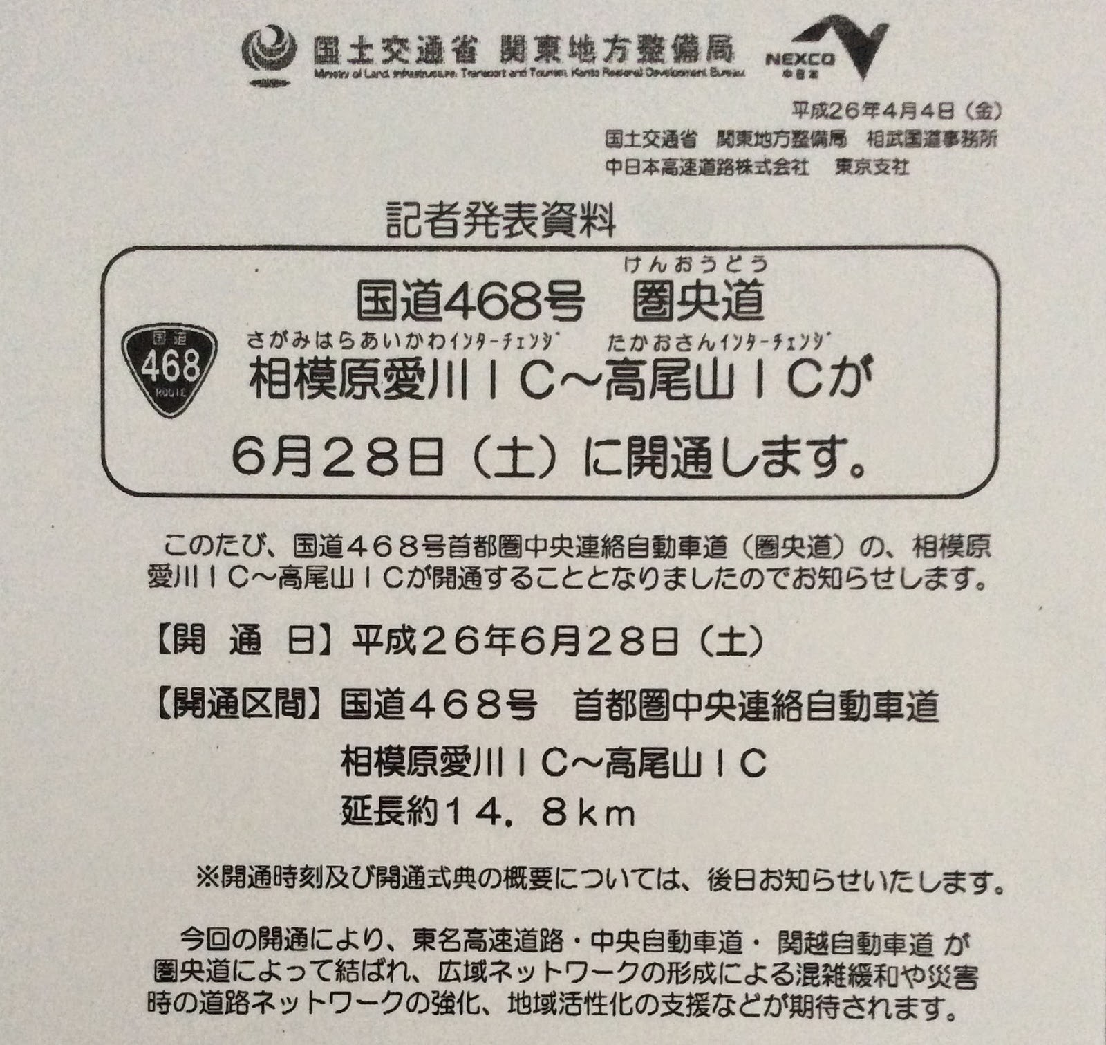 今回の開通区間は、相模原愛川IC~高尾山ICまでの14.8㎞の4車線であるが、相模原ICについては来年3月には開通される予定だそうだ。