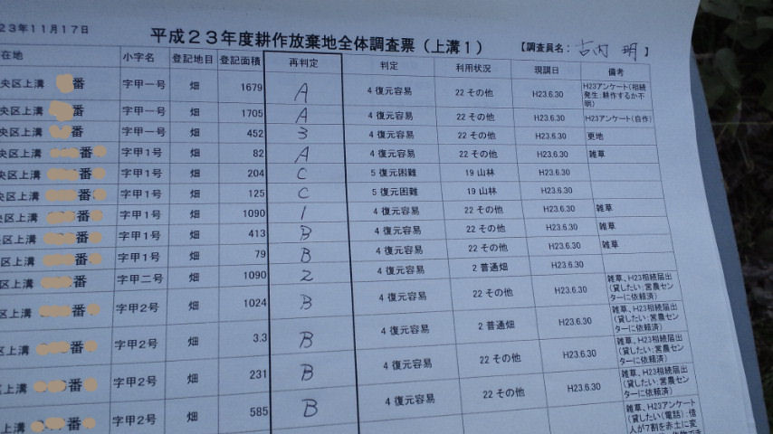 農地パトロール 2011年11月18日 最終更新日時 : 2011年11月18日 hiroshee 昨日午後、農業委員として耕作放棄地(上溝地区)の現地パトロールをおこなった。 参加者は、地区農業委員2名、自分を含めた応援委員2名、市職員(農業委員会事務局)4名の計8名で農地が適正活用されているか否かの調査であった。 耕作していない“畑”や、雑草生え放題の“畑”等々は全国的にも問題となっているが、相模原も例外ではなかった。 この調査結果を踏まえ、次回の農業委員会(あっせん委員会)の議題となるであろう。