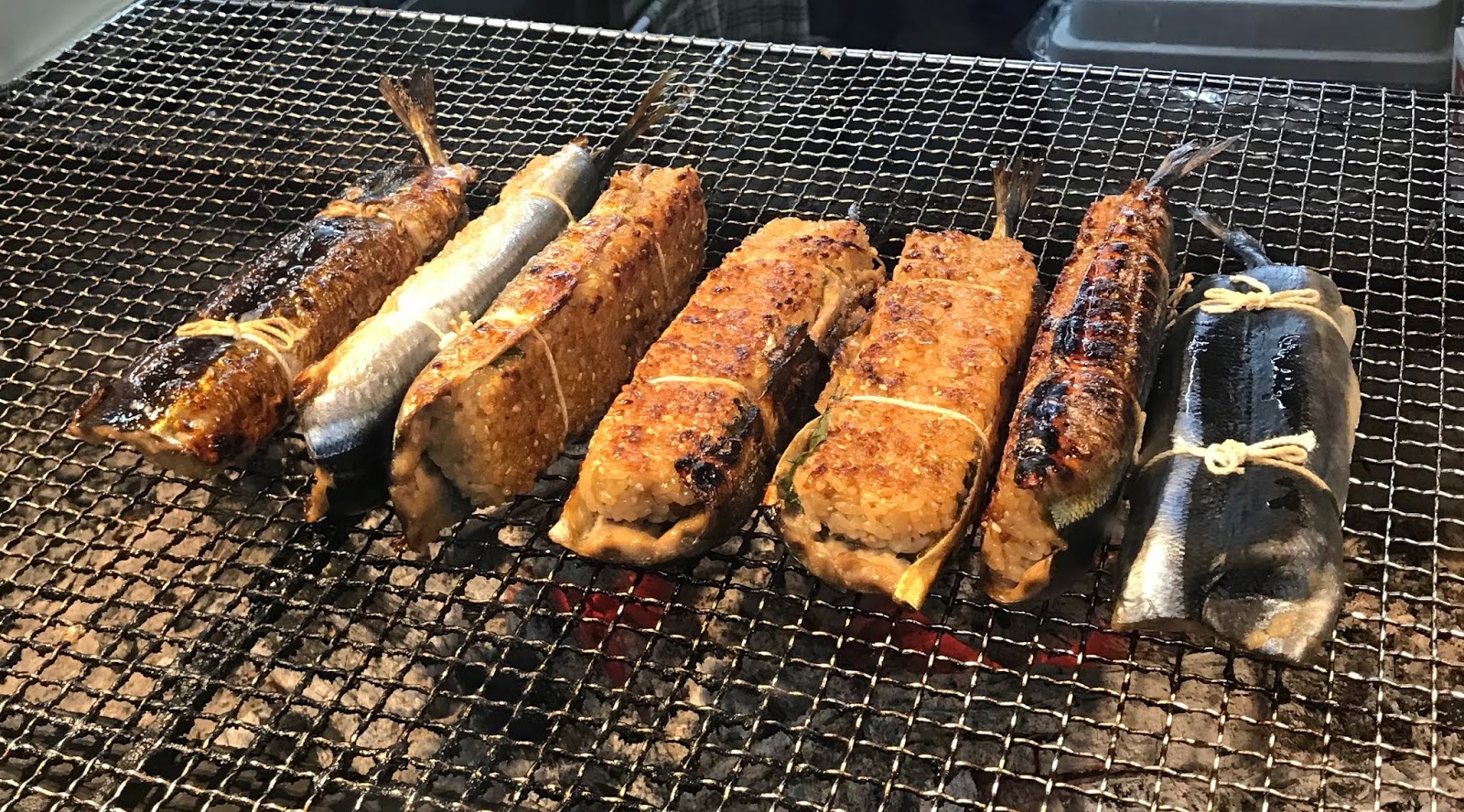 脂の乗った新鮮な北海道東産さんまを、食べやすいように骨を取り除き、秘伝の醤油ベースのタレに漬けこみ、北海道産米ともち米をブレンドした炊き込みご飯に、大葉を挟み込んだものを職人さんがタコ糸で縛る。