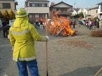 pm2:00 鵜野森自治会恒例の「どんど焼き」に消防団員として協力。子ども会役員さんや自治会班長さんたちが丹精込めて作った「だんご」を参加者が三つまた棒に挿し、五穀豊穣・無病息災・子孫繁栄を願いながら焼いて食していました。